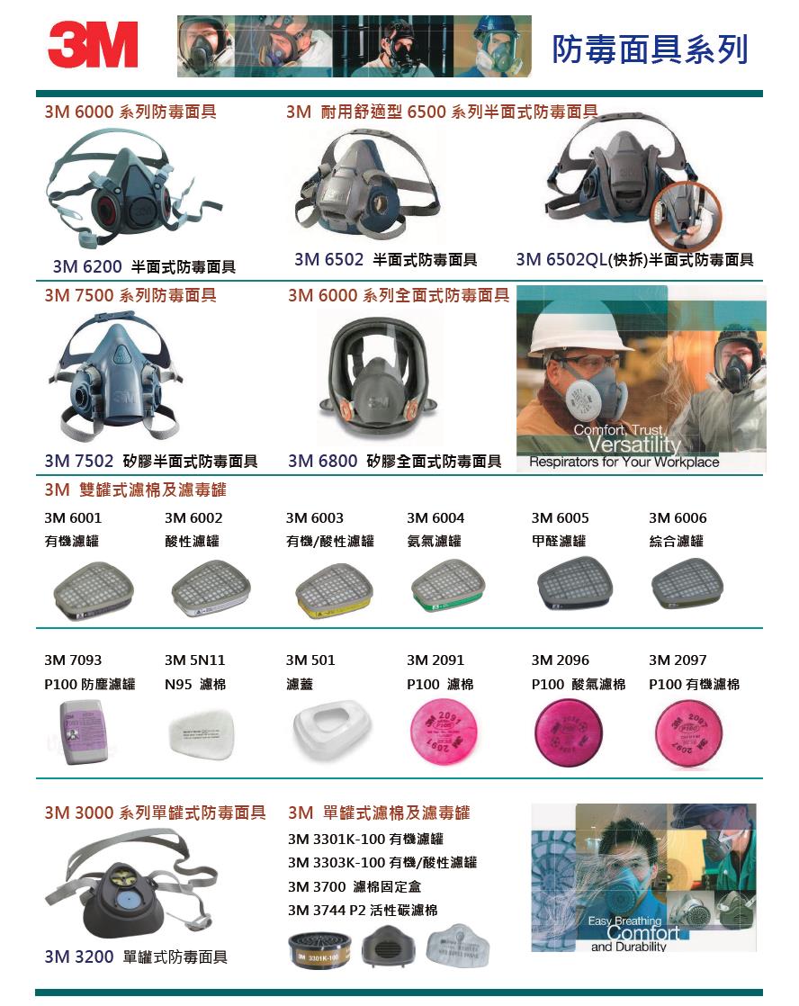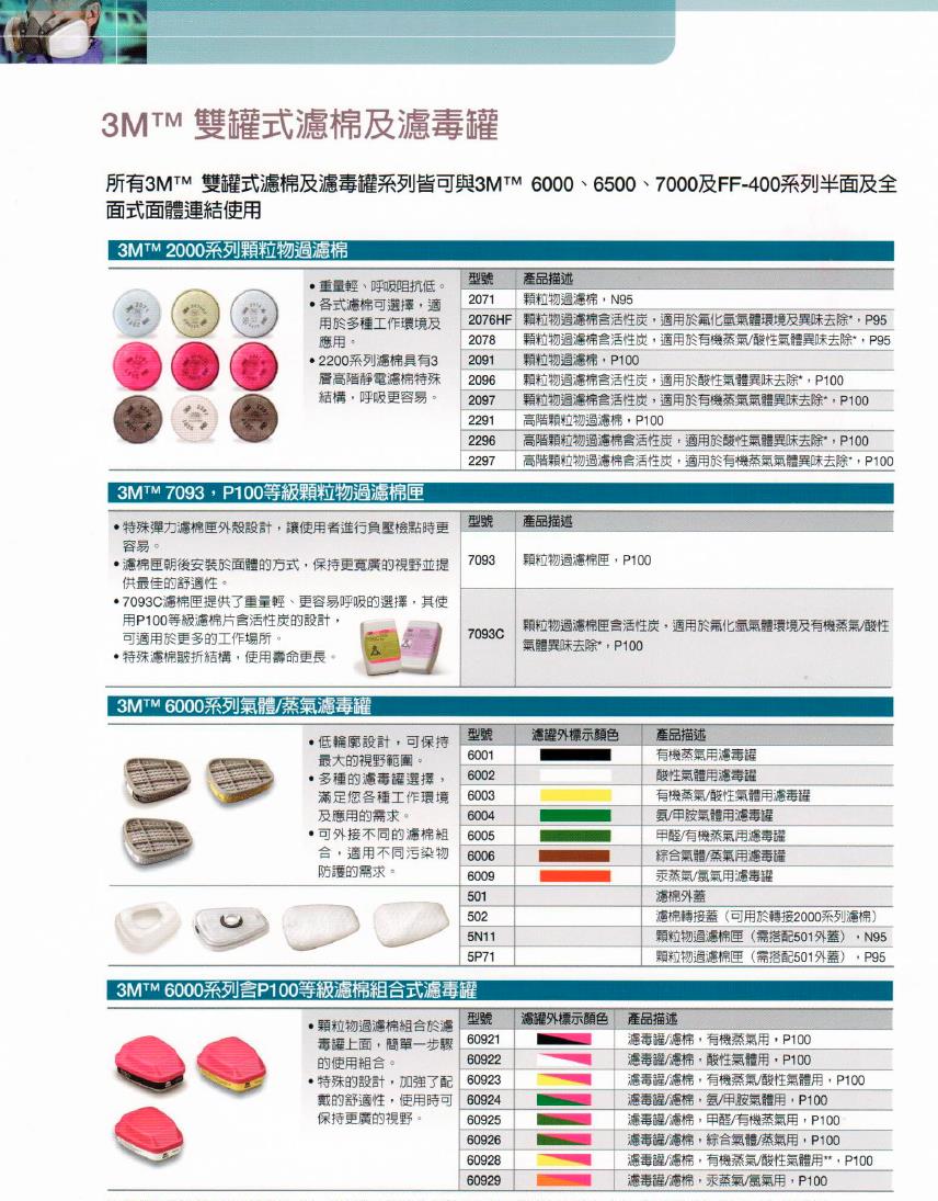 所有3M雙罐式濾罐、濾棉系列皆可與:6000、6500、7000 及 FF-400 系列半面及全面式面體連結使用。